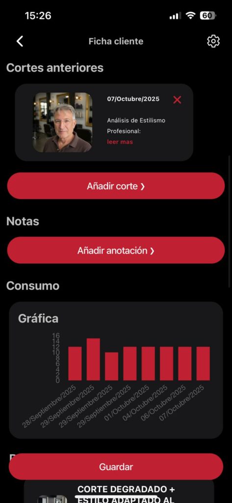Tu cliente puede ver y valorar cada corte. Podrás guardar cada corte que le hagas a tus clientes, para llevar un control completo.